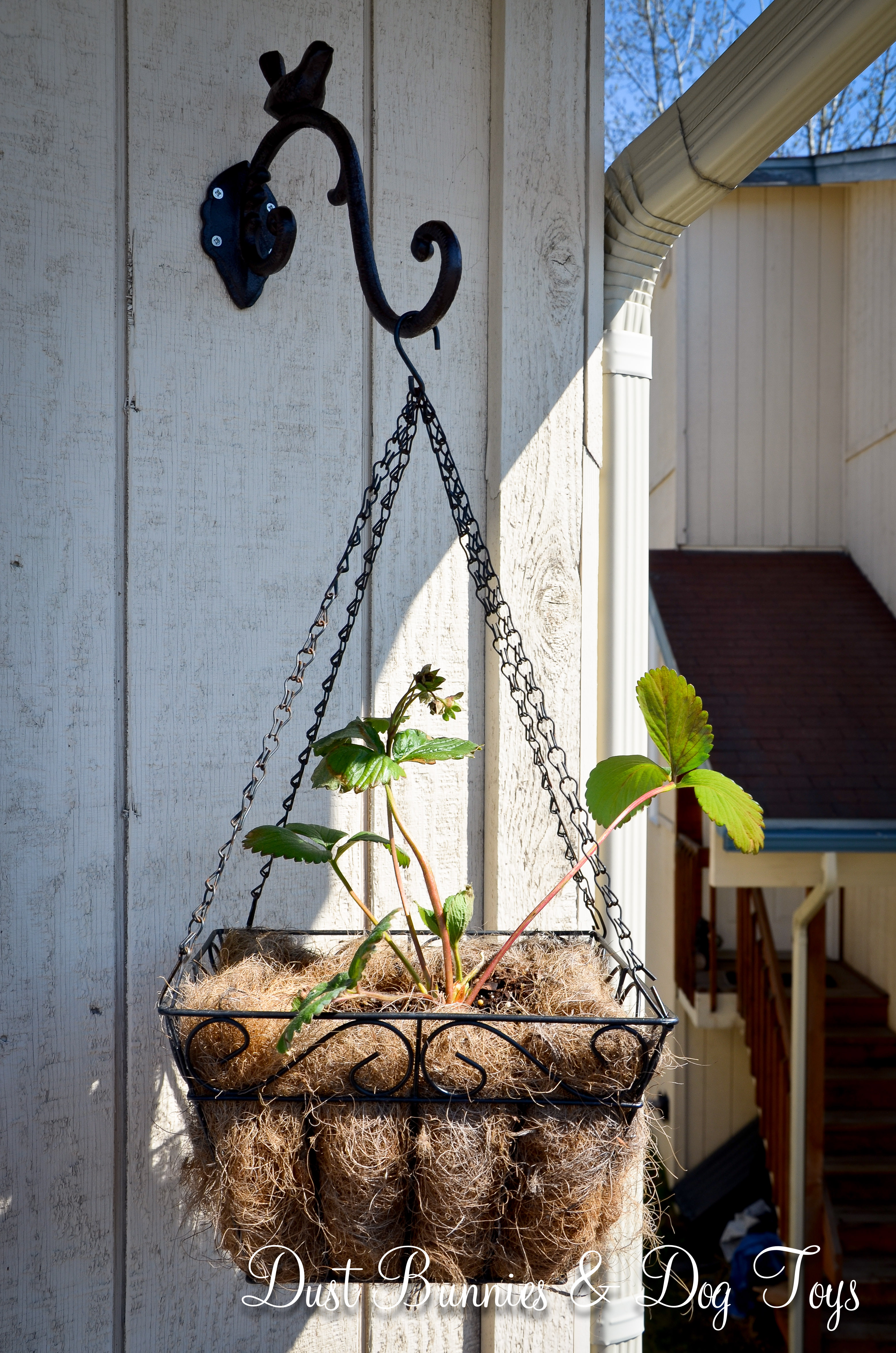 After I’d planted the strawberries in the hanging baskets I had to figure out where and how to hang them. I had these pretty bird brackets I’d purchased on DecorSteals.com for our new house several months ago and decided we should start enjoying them now. The hubs put up the brackets where I asked and I think they look great.
