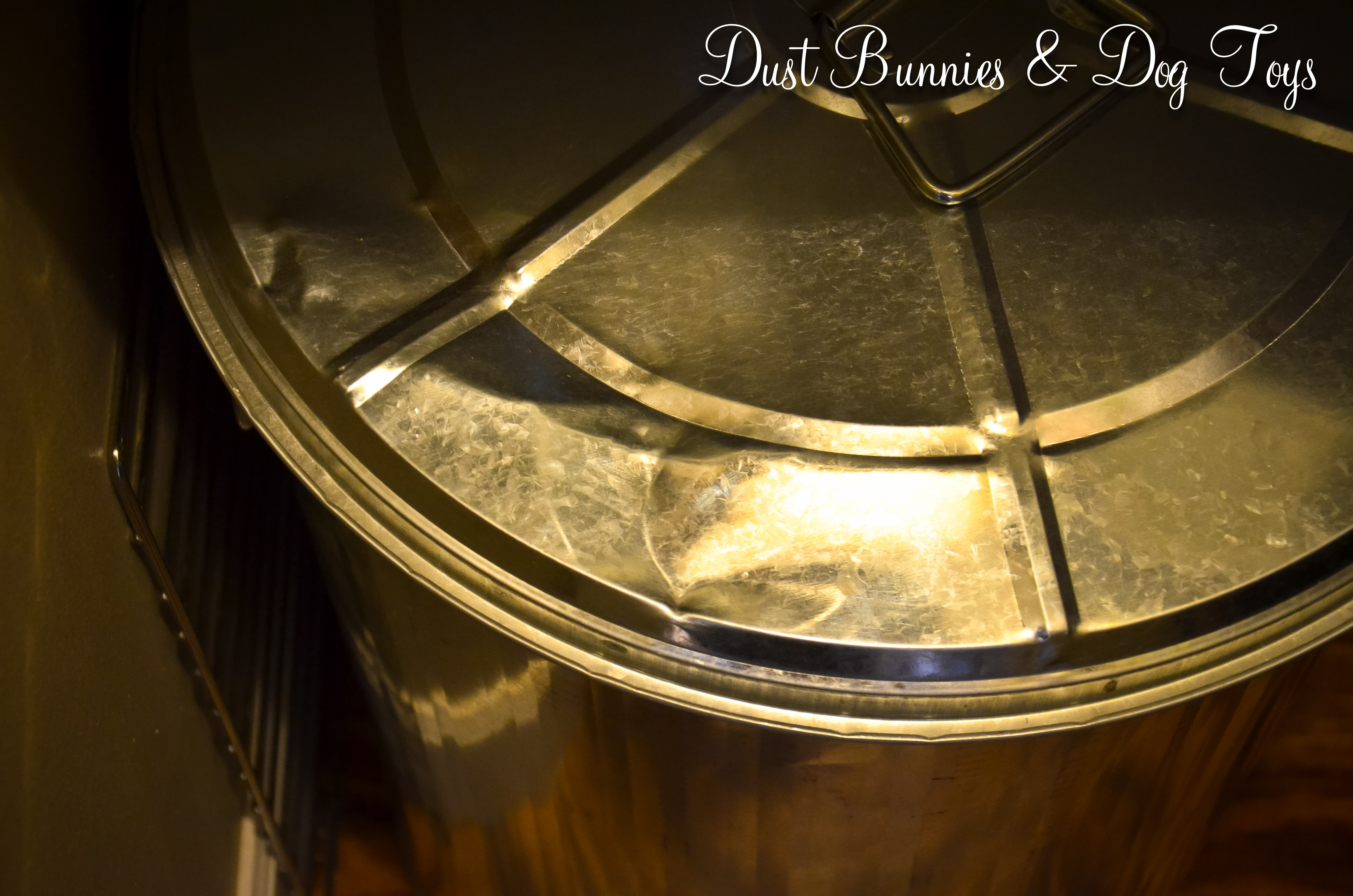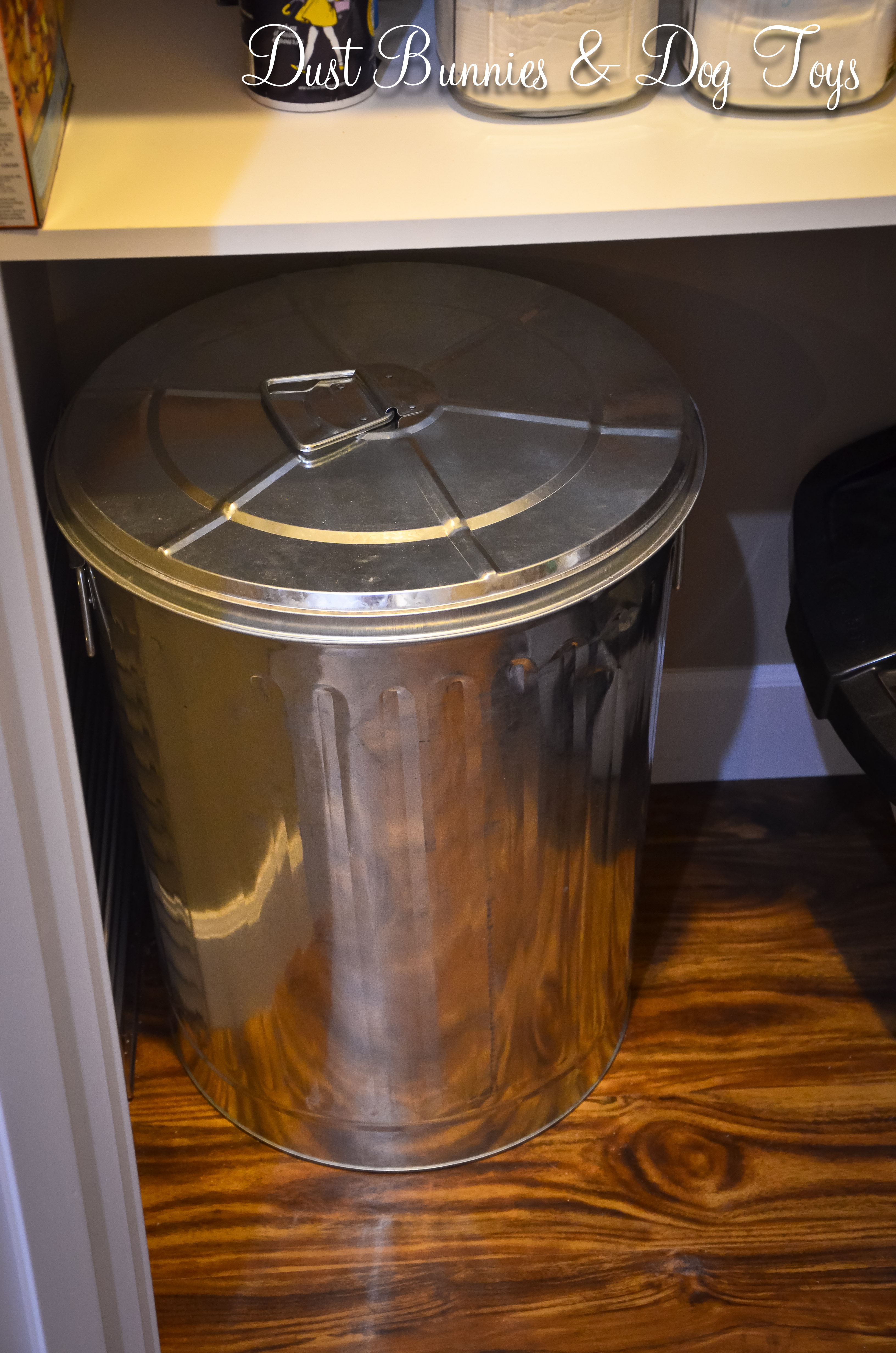 We also purchased a large galvanized trash can to hold the dog food so we didn’t have to squat down to scoop it out every time anymore. Now we just lean! This was the last can the store had and we got it for $5 off because of the dent in the lid, which when you put it on the right way is in the back under the shelf and not even noticeable anyway!