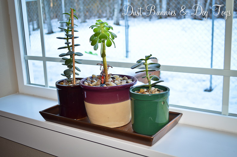 At some point in the hopefully near future the terrariums will once again hang in the windows, but I’ve given the hubs marching order that his priority is getting the garage unpacked and organized first – which will also hopefully result in him finding his fishing line to do said hanging! Once I rearranged everything there was still a bit of room in the laundry room window tray so I found another small container for future repotting, or even a new additional plant.