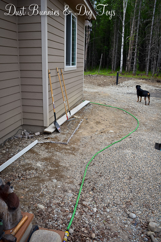 We also did a small bed between the porch and the garage, which included a walkway to the hose spigot on the wall. The pavers were a bargain find on a local buy/sell page for just $2/each, so we picked all we could and have a healthy stash for other projects.