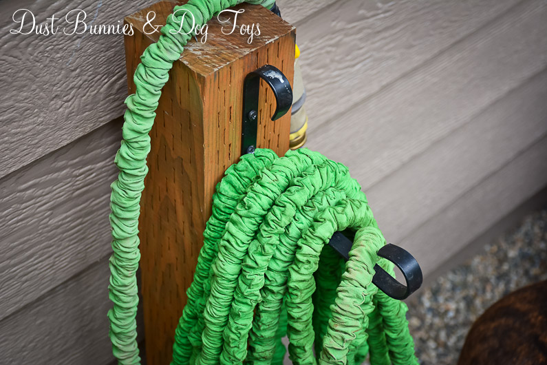 Since I have a fancy watering wand I just lean that against the pole, which allows it to drain if I don’t get everything out before coiling the hose. This is the first time I’ve used an expandable hose, but I love it because it’s light weight and easy to move. Plus it hangs on the bracket very easily without a lot of weight.