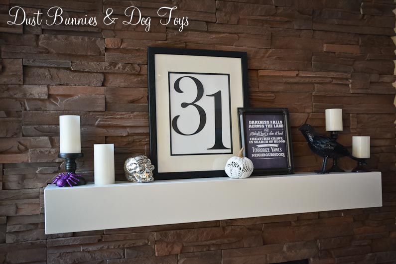 The artwork was a free printable quote from Michal Jackson’s “Thriller” that I found here and an oversized numeric cut out I made with my Silhouette. Both frames were items I already had on hand, so I just repurposed them. The skull lights up and was one of only two items I purchased this year. Originally priced $12.99 I got him on sale for 20% off, saving me a few dollars and the time I was planning to spend to create one that looked similar!