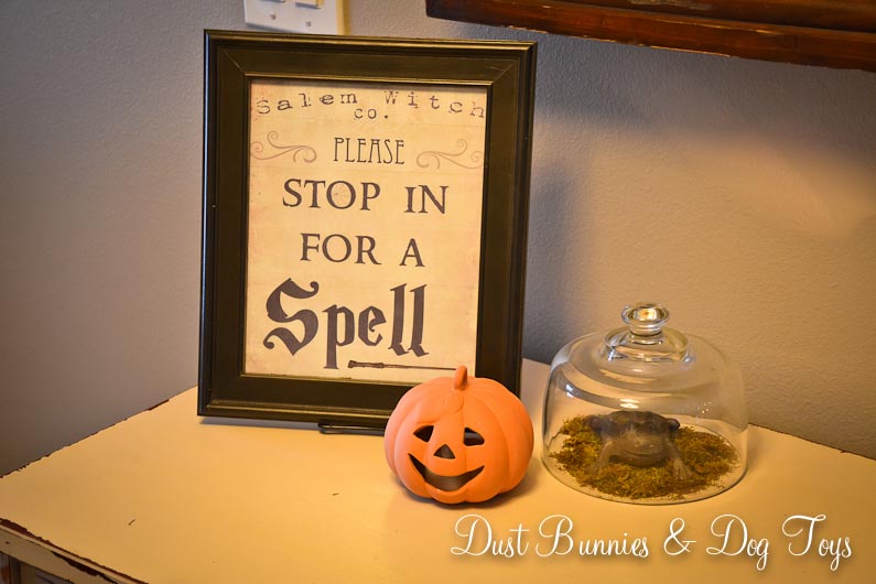 I added a little flameless votive in a small jar and a chalkboard sign to round out the vignette. On the other side I used another free printable, found here, paired with a fun little jack-o-lantern votive and a cast iron frog under a cloche. The jack-o-lantern is part of a set with metal hook posts that are meant to be put along a walkway, but I always worry that they will get blown off by the wind and break so this is a much safer option.