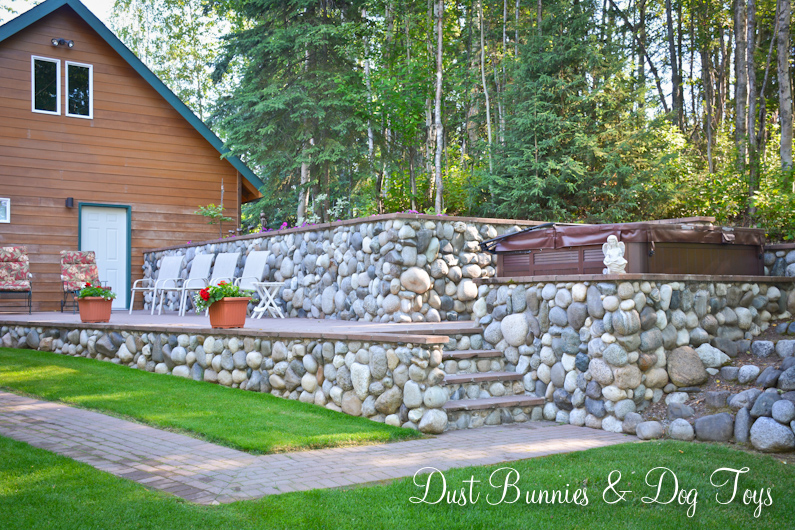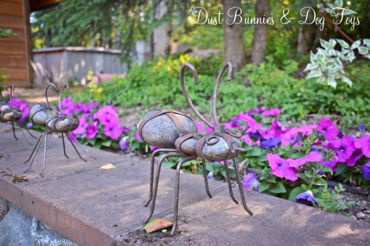 It was a lovely wood style home surrounded by a lush green lawn. Off to the side they had created a rock retaining wall and raised deck for their hot tub. The top of the wall was adorned with pretty annuals and several cool rock sculpture ants.