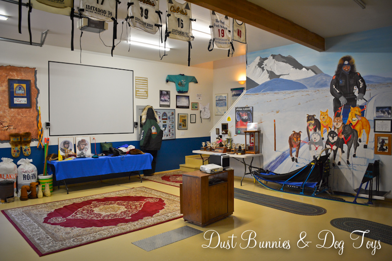 After exploring the gardens I visited the kennel’s building which was set up to entertain tourists and showcase Vern’s mushing career accomplishments. The mural on the wall was a great depiction of him and it was pretty cool to stand under the bibs he’s worn on the trail. The inside of the large bay doors also had a mural of Alaskan scenery and wildflowers.
