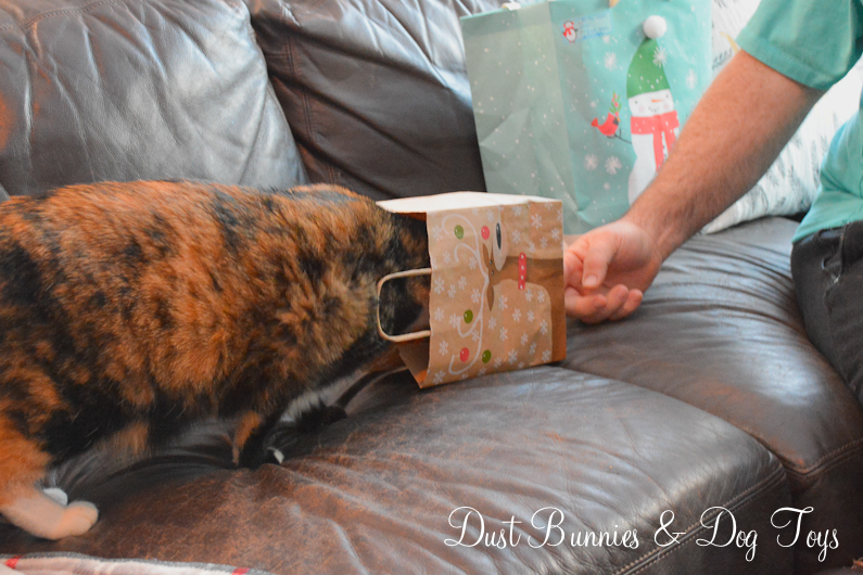 While the dogs were entertained with their first round of toys for a bit Luna got to open a few presents.  She wasn’t sure at first, but having seen the dogs open their gifts she decided to investigate.  You know that old adage about curiosity and cats… 🙂