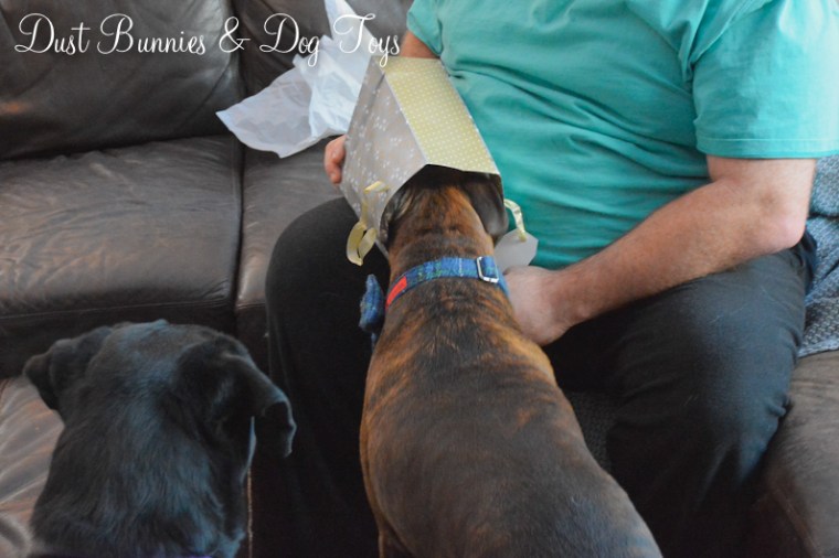 Now that the dogs were back to being interested in presents we moved on to the ones I had DIYed for them, with a special yummy surprise at the bottom.  Always the gentleman, Stoli again asked Daddy for permission before diving in.