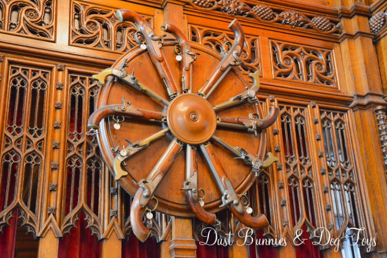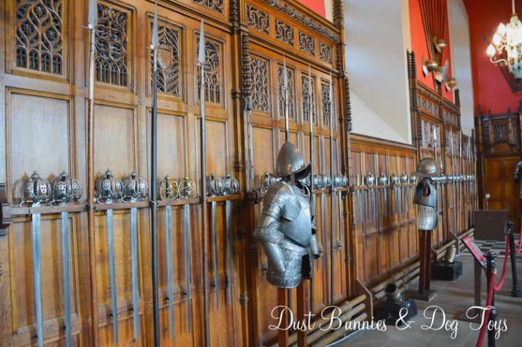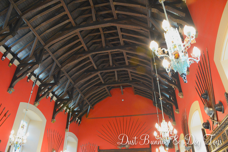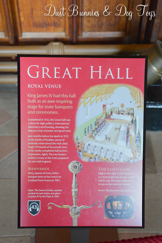 The great hall was an impressive structure indeed. Built to showcase Scottish power and style it was used to impress visiting dignitaries and nobles. The ceiling of the hall was built like the hull of a ship with massive beams that create an unique design. The walls were decorated with various weaponry and armor and several of the windows had elaborate stained glass panels. There was also a secret spy hole called the Laird’s lug where the King could see what was happening in the hall from above. You can just make it out behind the light in the second picture.