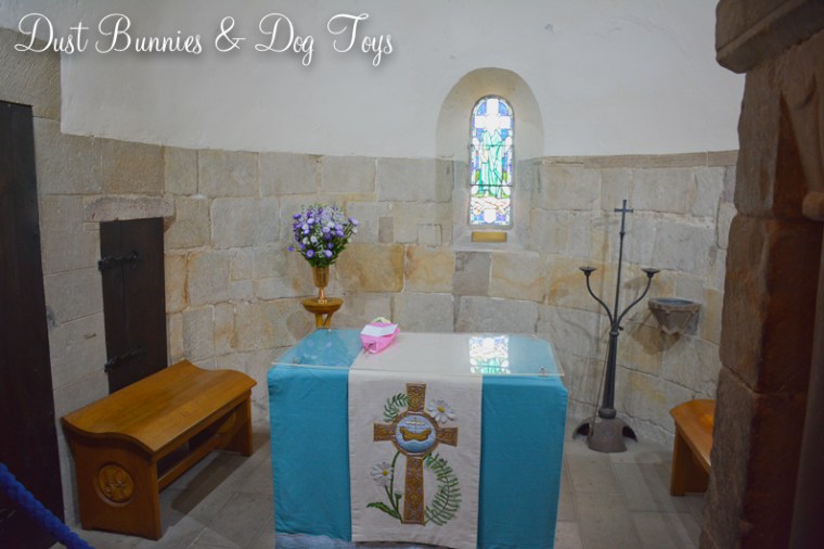 Nearby is the very small St Margaret’s Chapel, the oldest surviving building in Edinburgh. It would only hold about 29-30 people at a time, so visitors took turns viewing the interior of the chapel where there was a small alter at the front and a few benches to line either wall. Stained glass windows were installed when the chapel was restored in the 1920’s and depict four saints including Margaret herself (the closeup below) and the national hero, William Wallace.