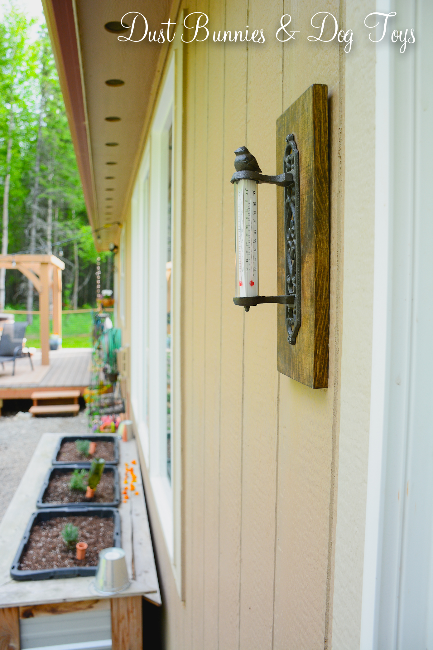 The new table is a perfect fit for our deck and it expands if we have a big group over.The firepit is cleaned out and ready for use.The new lounge chairs (with a hiding kitty) and partially installed gazebo on the big deck. I’ll be landscaping around this deck later this summer and plan to mirror the rock bed around the other deck.I updated the wood storage for the fire pit with some cinder blocks that we took out when the Hubs expanded the chicken coop. It was an easy, and free upgrade that also hides the electrical conduit for the hot tub.I white washed terra-cotta pots to decorate the whiskey barrel tables and filled them with marigolds to ward off the bugs. I also placed small tiki torches on each table as a backup.I’ve had this thermometer since last summer and we finally found a spot for it right next to the door.