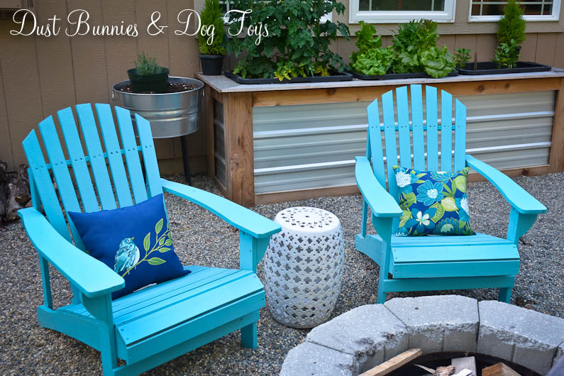 And they coordinate perfectly with the two over-sized navy pillows I got at Sams club earlier this summer. I plan to paint an aqua pineapple design on the drop cloth pillow I have on the sectional and will add navy grain sack stripes to the ones on the table chairs over on the deck so there’s a cohesive color scheme throughout the area.