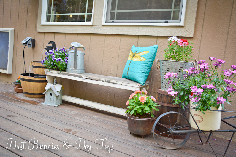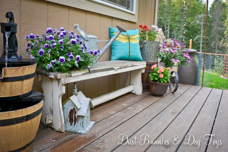 It was a steal at just $30 and I knew it would look great on the deck – plus it can double as a photo prop for large families! It’s the perfect amount of chippy paint and classic lines for my style. I placed it under the dining room windows and flanked it with our whiskey barrel fountain and a wooden barrel we picked up on our last trip to Portland. Then I added in plants and a bird house to finish off the look.