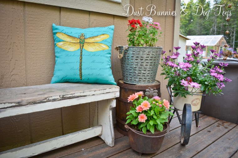 This arrangement brings so much color and life to this side of the deck. Most of the plants I used are in pots with minimal or no drainage so being under the eave of the house is a smart choice, plus they all have a rustic vibe to them so they pair well with the worn bench.
