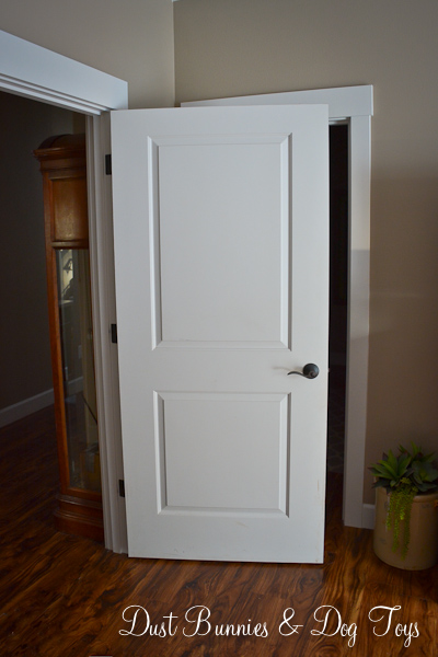 It drove us nuts to have to come in and move the door to get to the closet every time we came home or pulled the hampers to do laundry. It’s such a minor, trivial thing but it was an every day thing which made it seem even more annoying. The Hubs decided he’d had enough and did some research online to figure out what he needed to do to swap the direction of the door.