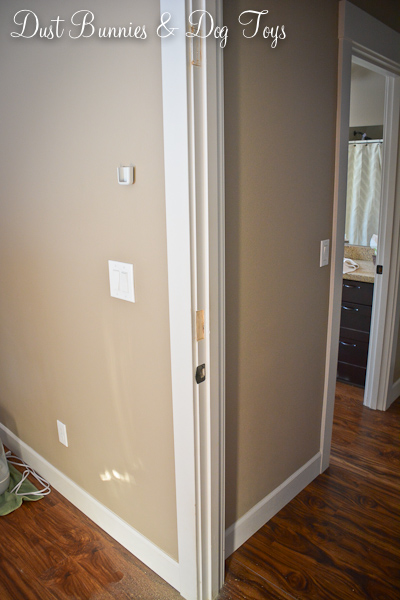 …to this! Look how much more open it makes the space feel! Now the door swings back flush against the wall, leaving nothing blocking the entrance to the closet – just how we always wanted it. We left the light switches right were they were because we rarely used them thanks to the remote for our overhead fan/light combo. We also have switches for the overhead fixture by the bathroom door so we can always use that instead. The Hubs relocated the holder for our light/fan remote to the open side of the door so we have easy access to that if we want to turn the light off as we leave or on as we enter.