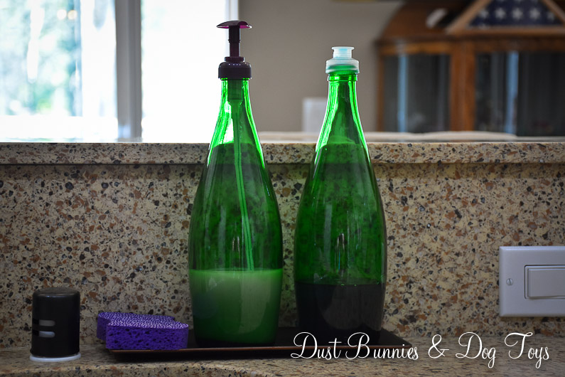 I recently found some pretty green bottles and instantly knew that I wanted to use them in the kitchen for the hand and dish soap.  I lucked out and the top from the store dish soap bottle fit the glass bottle perfectly.  It even screwed on tight without a hassle.