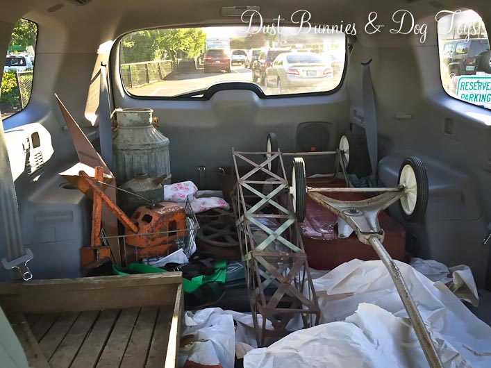 After almost 2 hours of shopping here, the final haul all loaded up in the car. Notice that tall trellis in the middle? That was a surprise. I saw it and loved it but thought it would be too difficult to get back to Alaska so I passed over it, but the hubs secretly went back and bought it while I was at another booth! Yeah, he won some serious brownie points on that one! I spent a good portion of the ride home just looking back at everything grinning like the Grinch.