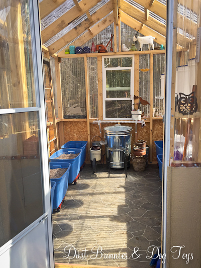 In the back I added a large galvanized trash can under the window to hold extra dirt and the Hubs installed a wire shelf above it to serve as a potting bench. That way when I’m preparing pots for the deck and porch if I spill it can fall right back into the dirt bin. Plus the way he installed it I can lift it up against the window if I want it out of the way for any reason. The ledge created by the wall framing was the perfect spot to store all my garden decor over the winter. Once the yard finishes thawing out I’ll be moving those items out to their ‘summer homes’ and that space can hold any extra pots awaiting occupants. My hand tools will be kept in the small tub you see on the shelf, which will be filled with sand to keep everything sharp – an idea I found on Pinterest of course.