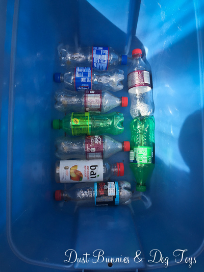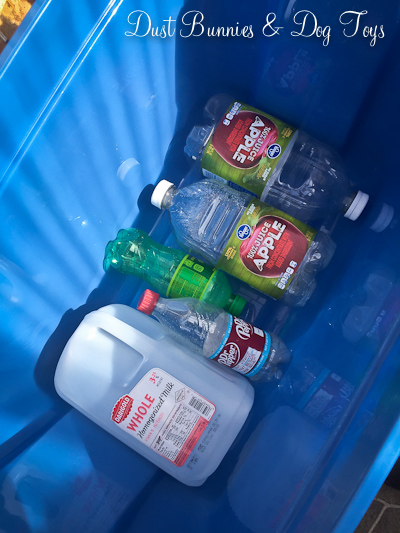 We purchased large plastic totes to serve as our planters in the greenhouse. I filled the bottoms of each with plastic containers from our recycle bin – plus a few from the coffee shop at work – to help fill some of the space to reduce the amount of soil I had to use and provide space at the bottom of the containers where moisture could settle and then be wicked back up. There are no drainage holes in the bottoms of the totes as that would become quite messy on the floor of the green house so I’ll have to water carefully.