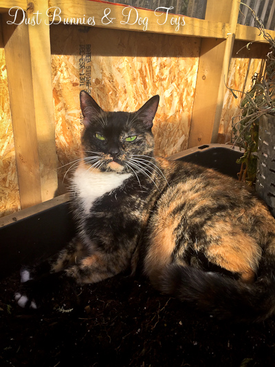 After that I made Luna move off the table so I could drag it out to the deck. When I returned she had found a new favorite spot in one of the planter boxes. I let her be as I sorted and dug out everything else to make room for the new set-up.