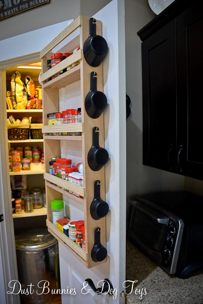 I’m still debating painting the screw heads on the corner brackets, so I’ll live with it for a while and if it bothers me in a few weeks I’ll make them match. The Hubs also got wooden dowels to make faux steel rods along the back of the shelves like the inspiration pieces had, but we haven’t added them yet. I really liked that detail, but because I’m using baskets rather than styling it with decor they wouldn’t be super noticeable, so it may not be worth doing. I’ll decide on that eventually. 🙂