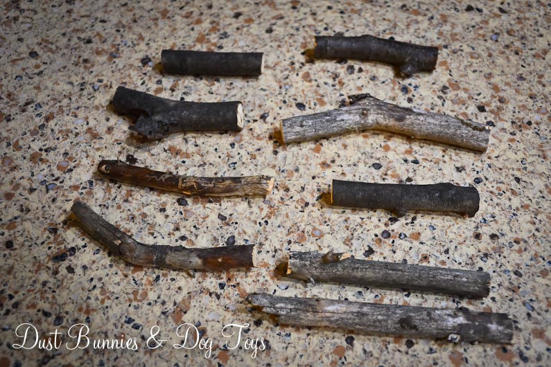 I let my pile of sticks “dry out” on the porch for a few days, ok, weeks – which caused several of them to fall victim to puppy playtime. But I digress. Once I deemed them “dry” I chose a few with interesting texture and curves and marked off sections for the hubs to cut. Yes I could have done it myself, but have a bad history with sharp objects so he came to my rescue.