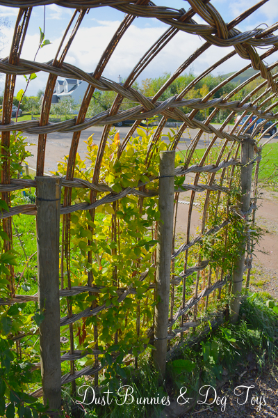 Behind the green house was another courtyard space. This one was bordered by raised beds and a lovely wicker style trellis. I’d love to create something similar to this when I develop the lower area of our yard in the next year or two!